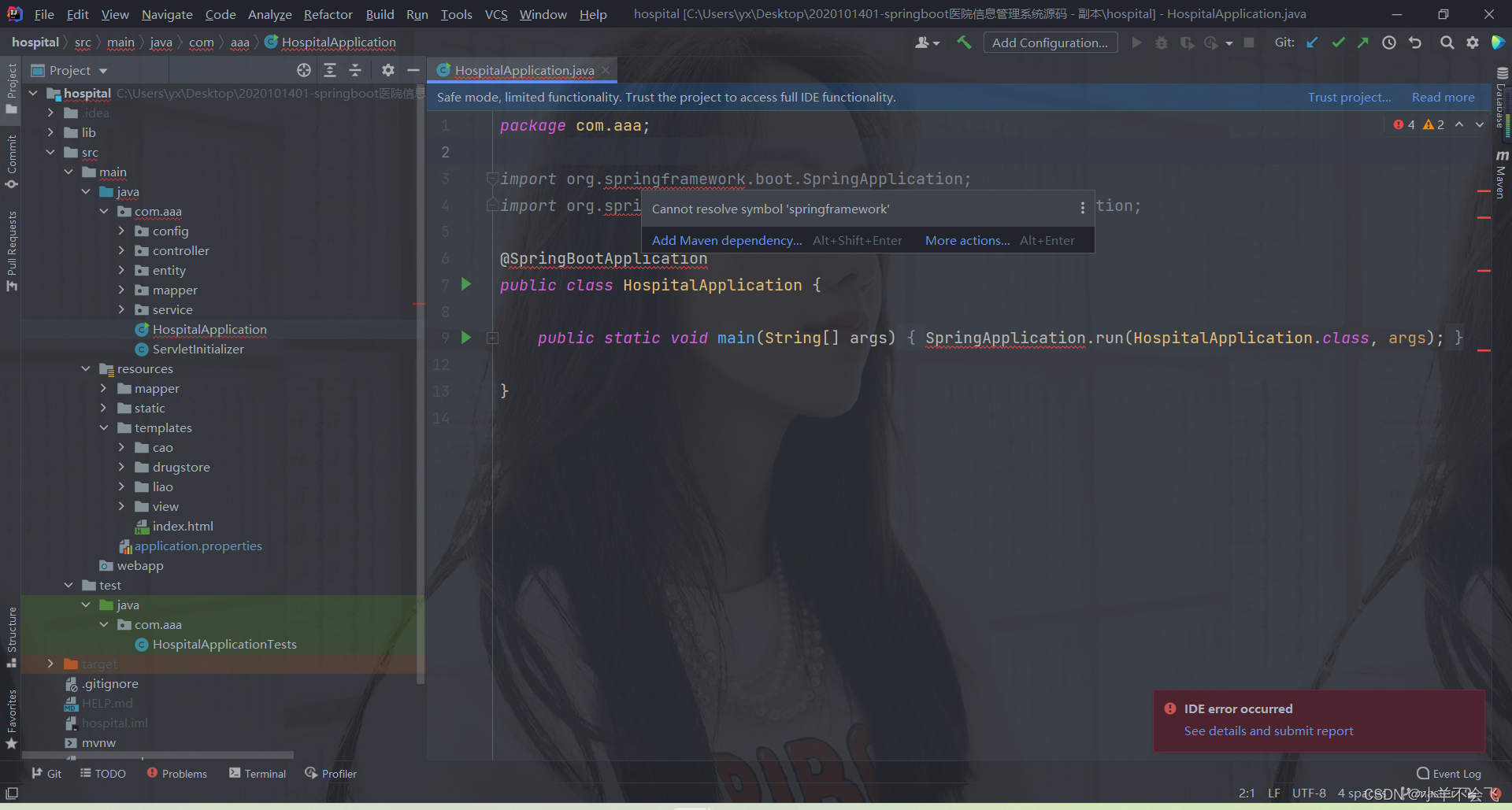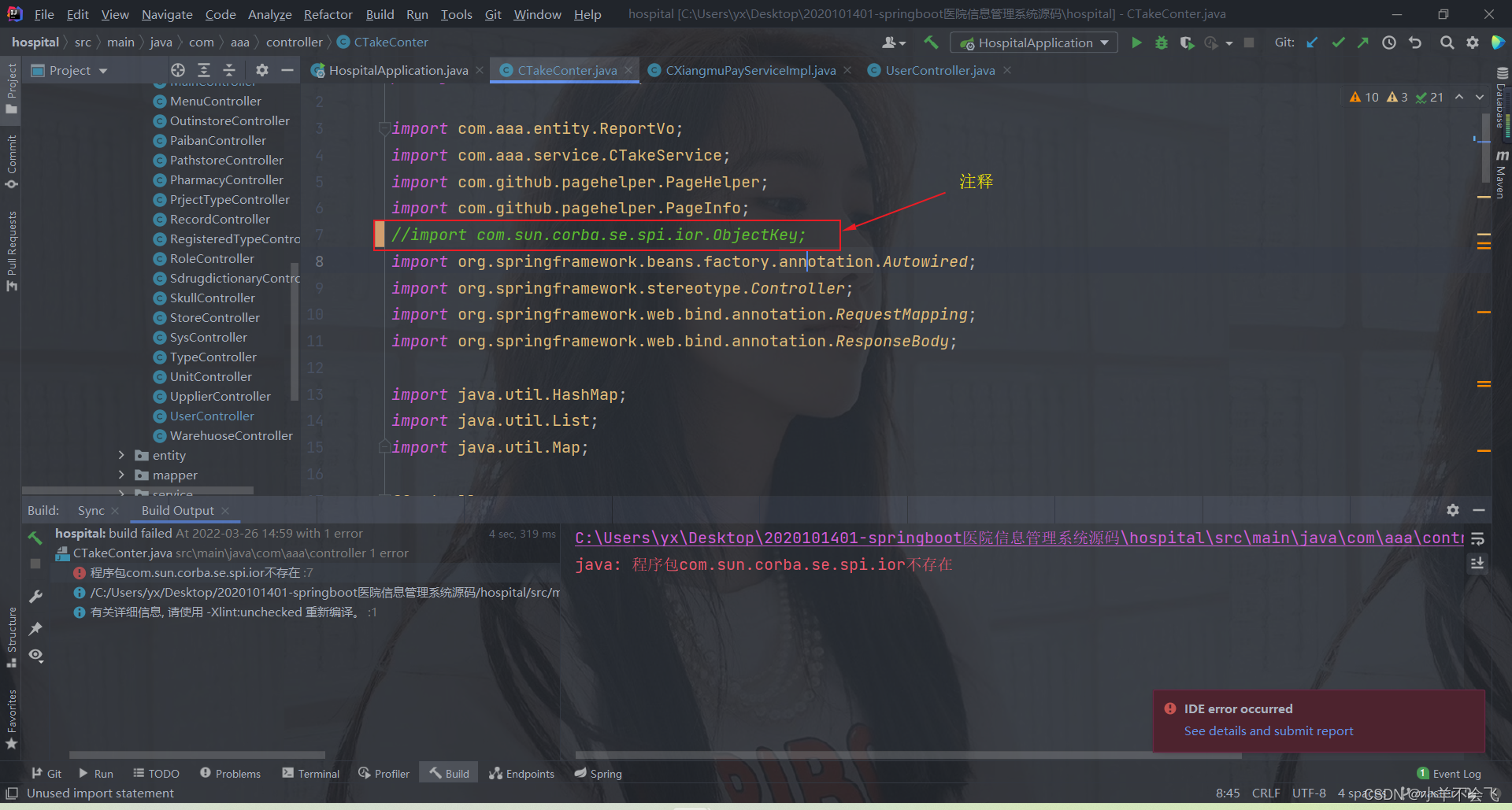 IDEA显示有两个包不存在,无法运行,这个简单啊,我们先直接注释试试,简单又暴力,看看我们的程序能不能跑起来!