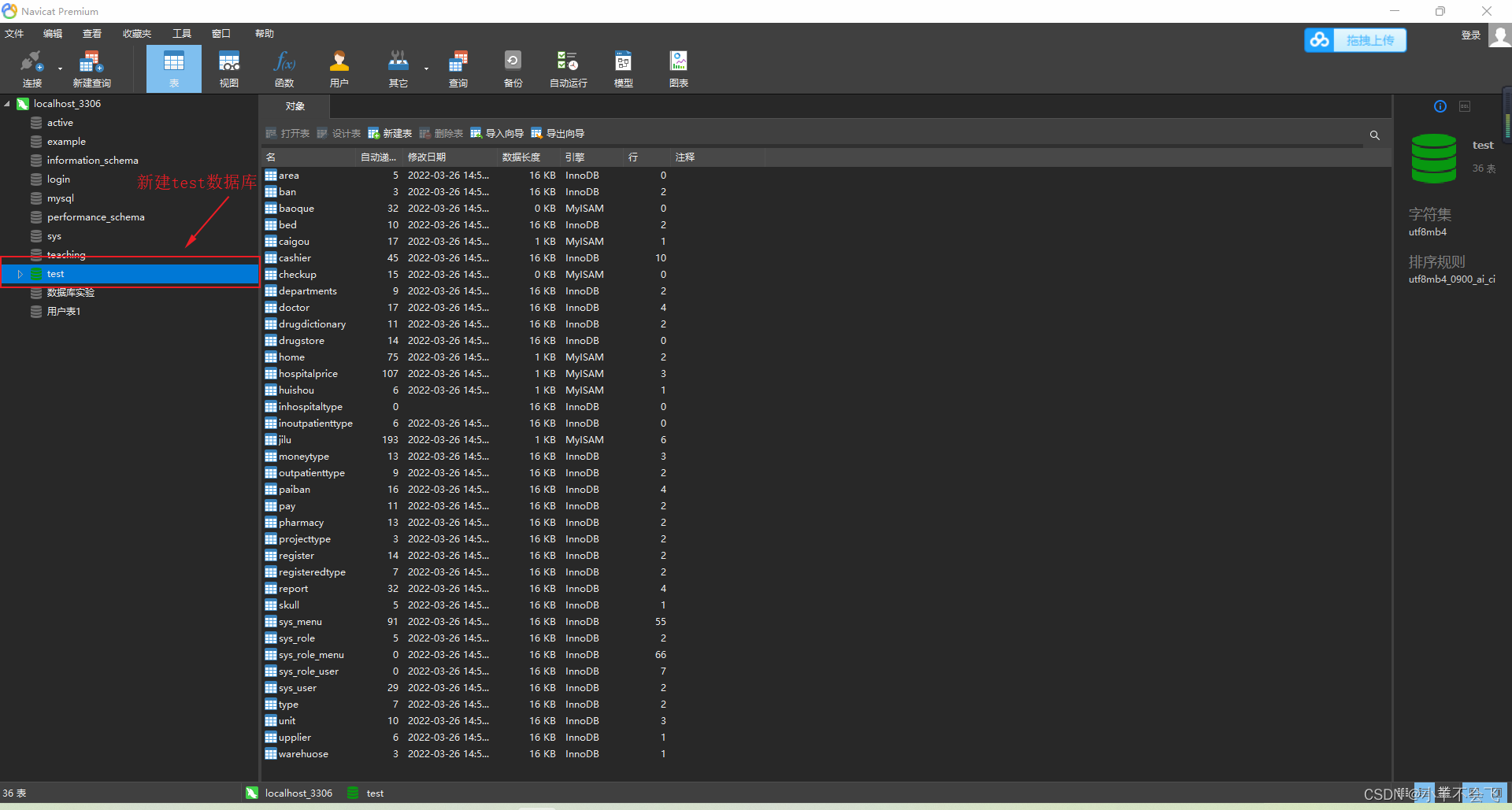 我么需要打开本地的Navicat或者Webpack(数据库的可视化软件),博主用的是Navicat,打开后新建一个test数据库
