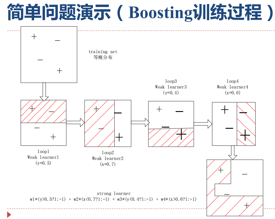 在强学习机的组合中增加一个加权的弱学习机,使准确率提高,损失