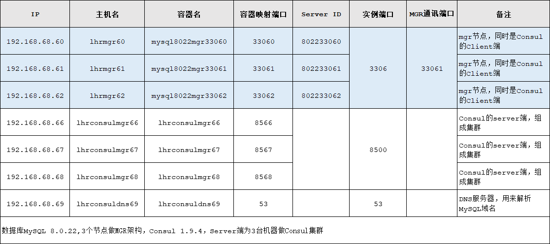 本次环境一共包括7台机器,其中3台做MySQL的MGR数据节点(其上也需要安装Consul,作为Consul Client),单主模式,还有3台做Consul Server集群,实现Consul的高可用,剩下一台做DNS服务器,用来解析MGR节点域名,规划如下表所示:
