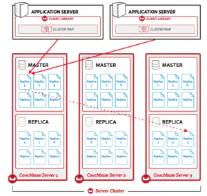 集群内复制主要针对同一个集群中多个节点的数据进行多份复制备份,并且复制的份数会分布到不同的节点中。在数据分布中我们知道每个节点都会储存有效的 vbucket和复制的vbucket。如下图展示,当应用对数据进行写操作,此操作会先到集群节点中所对应有效的vbucket的数据进行写操作,并 且有效的vbucket节点会根据DCP协议传输写操作的变更传输到复制的vbucket所对应的节点,对复制的vbucket进行变更。可复制的 vbucket的份数,可以在操作bucket的时候进行配置,备份数量为1-3份。