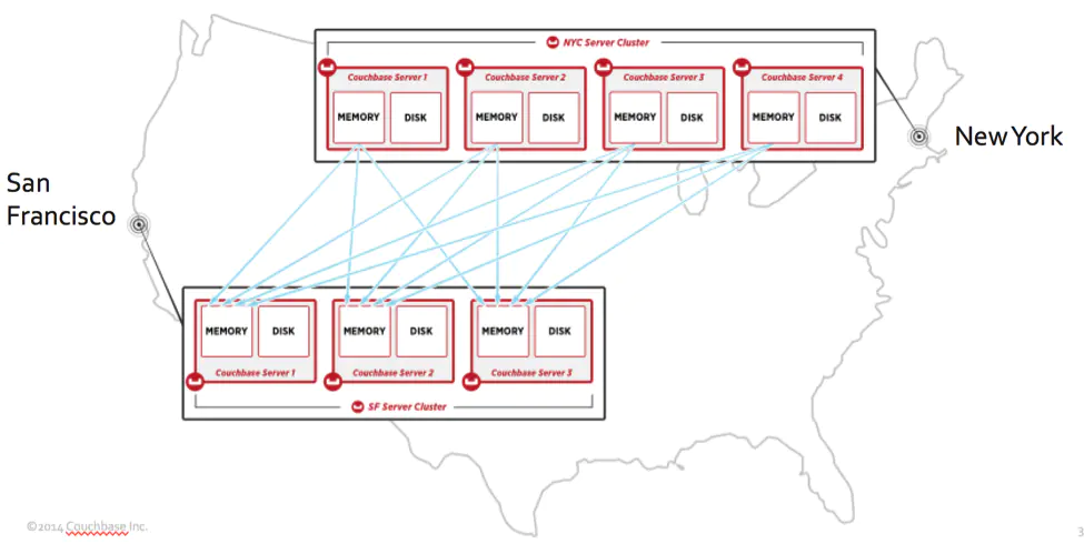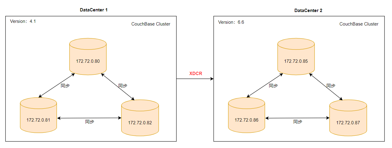 跨数据中心复制主要是针对多个集群间的数据复制,此种复制主要以异步的方式通过XDCR协议同步数据到其它集群中备份,从而实现单集群或机房出现问题级的容灾。跨数据中心复制是以bucket为单位进行复制的,在管理员操作界面可以通过配置XDCR来进行此种复制方式,下图为跨数据中心复制示例图: