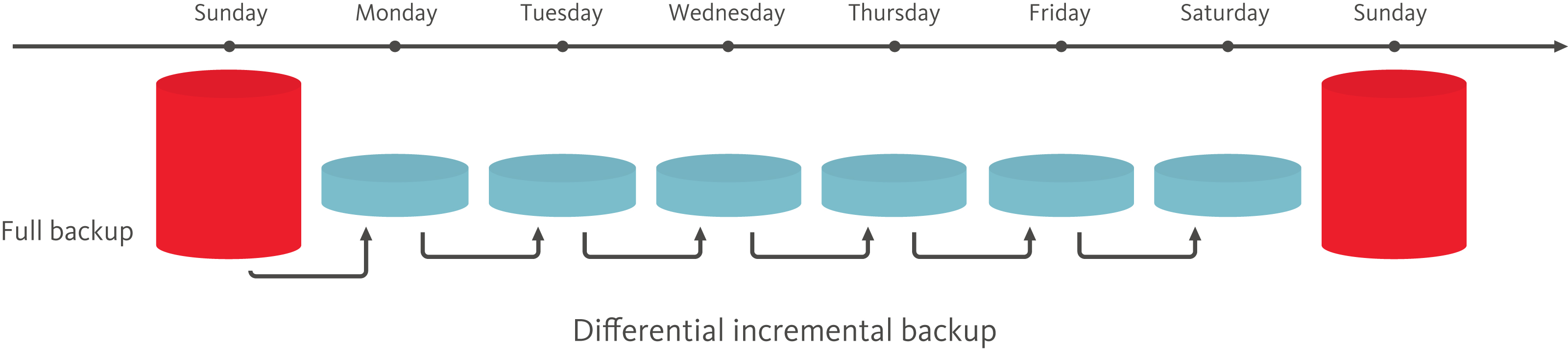 在本例中,星期一备份包含自周日完全备份以来所做的更改,星期二备份包含自星期一备份以来所做的更改,星期三备份包含自星期二备份以来所做的更改,依此类推。例如,周三执行的还原操作使用周日的完整备份以及周一和周二的差异增量备份。