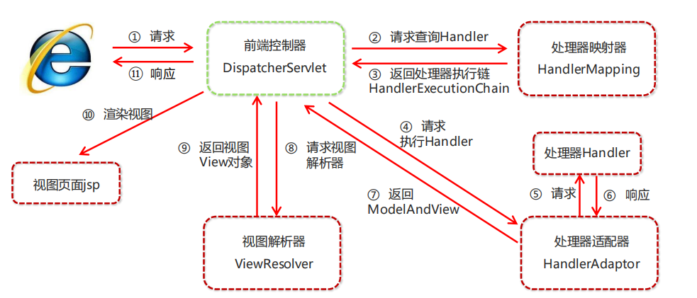 ⑩ DispatcherServlet根据View进行渲染视图(即将模型数据填充至视图中)。DispatcherServlet响应用户。