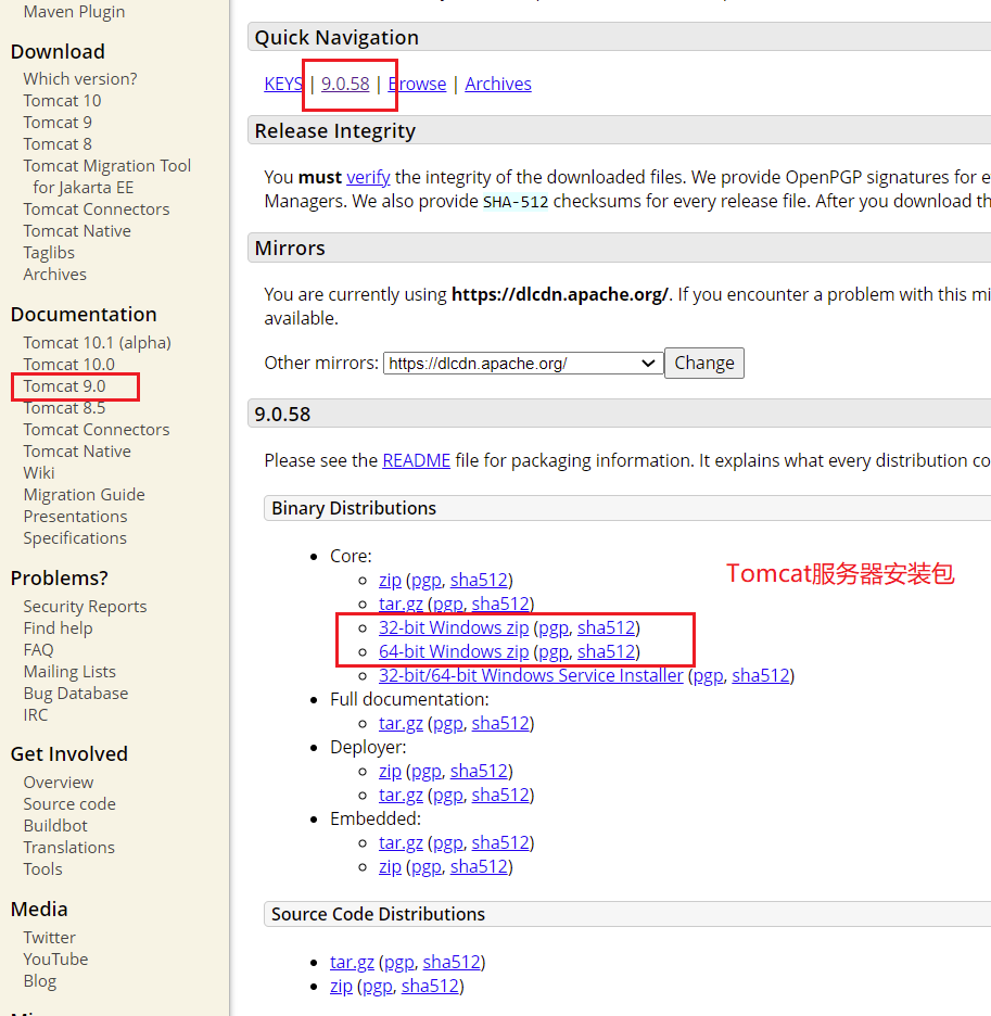 点击Tomcat9,可以看到下载的版本是9.0.58,点击下载对应的服务器安装包。