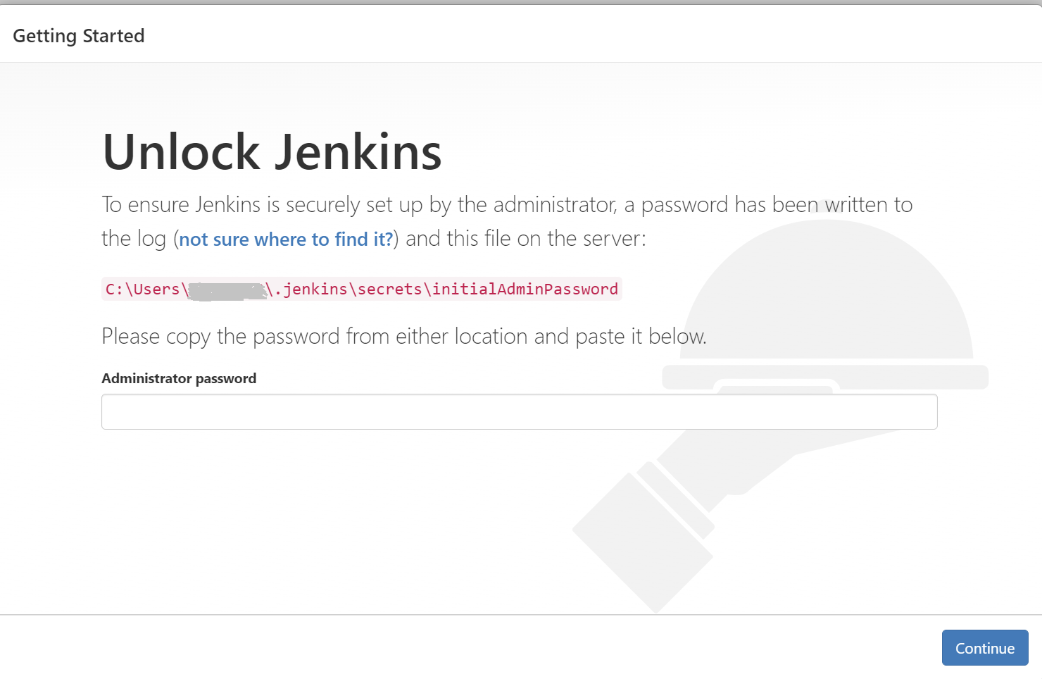 2. 第一次打开jenkins会要求输入密码,根据网页提示找到对应路径下的initialAdminPassword,然后复制其中的密码粘贴到网页上然后点击Continue。