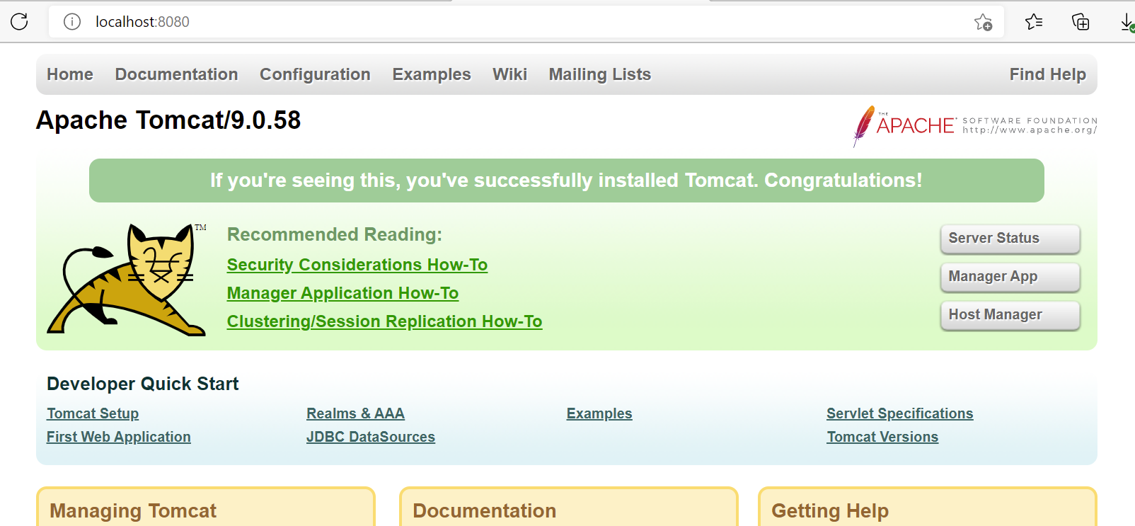 3.将命令窗口最小化,然后在浏览器上输入网址http://localhost:8080,能打开tomcat首页说明前面的配置都是正确的。