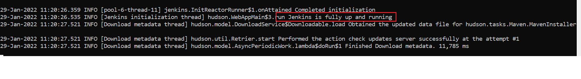 2. 当出现jenkins is fully up and running时,说明服务启动成功。--- 强调:只要使用jenkins,那就千万不能关闭命令窗口,将它最小化之后保持后台运行状态即可!!!