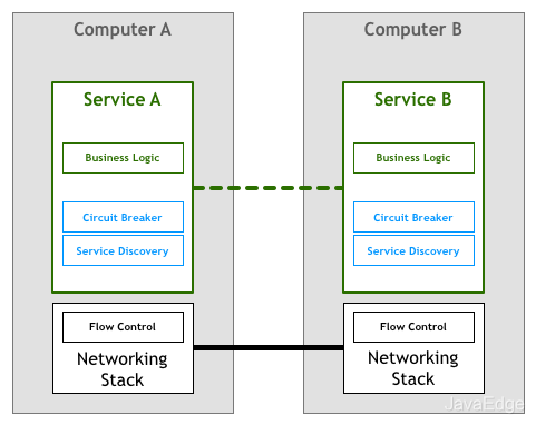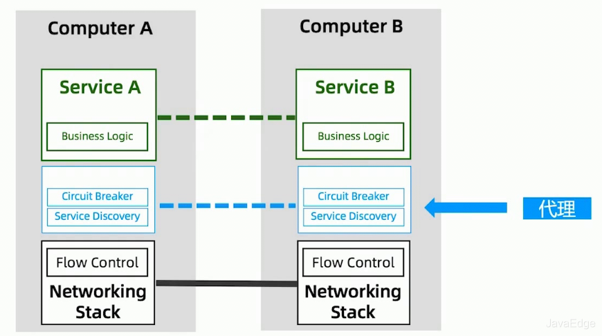 许多从业人员发现的解决方案是将其作为一组代理来实现。即服务不会直接连接到其下游依赖,而是所有流量都将通过一小段软件透明地添加所需的功能。