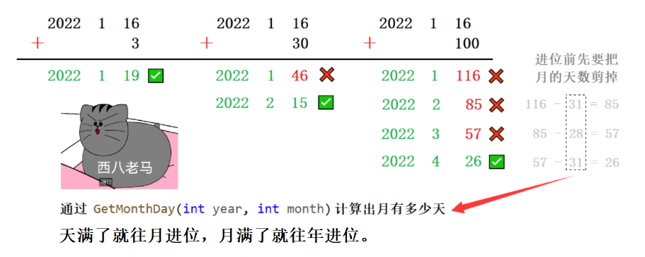 之后加上通过 GetMonthDay 获取当月对应的天数,就是所谓的 "借",