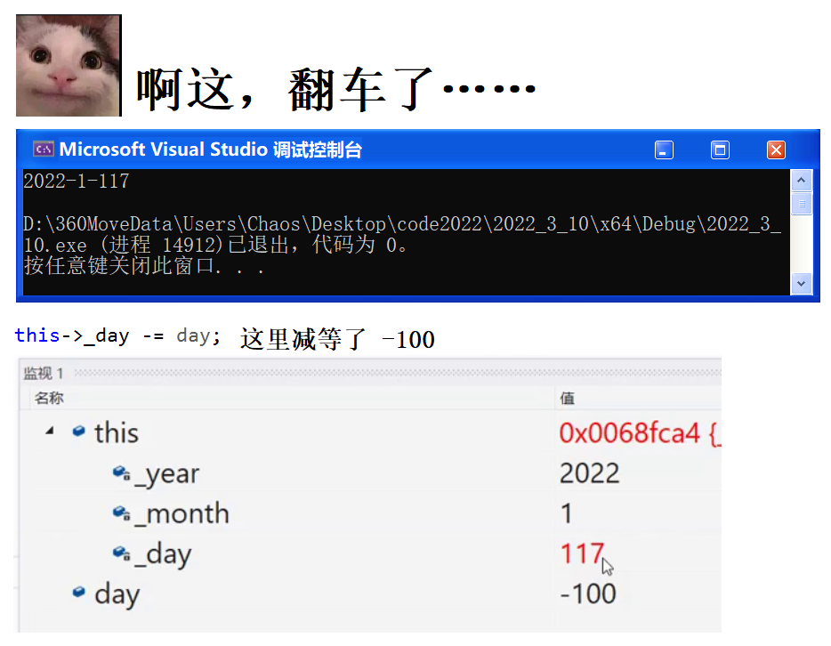 我们发现,在设计 operator-= 的时候是 <= 0 才算非法的,所以这种情况就没考虑到。