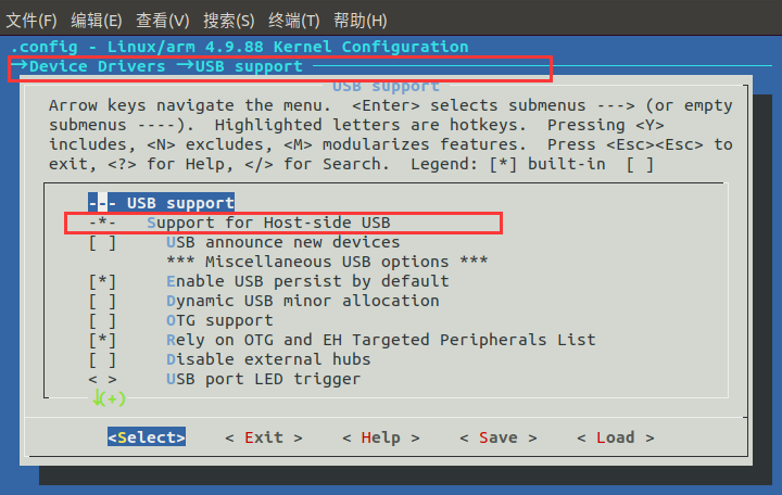 在内核路径输入命令make menuconfig进入内核配置界面。