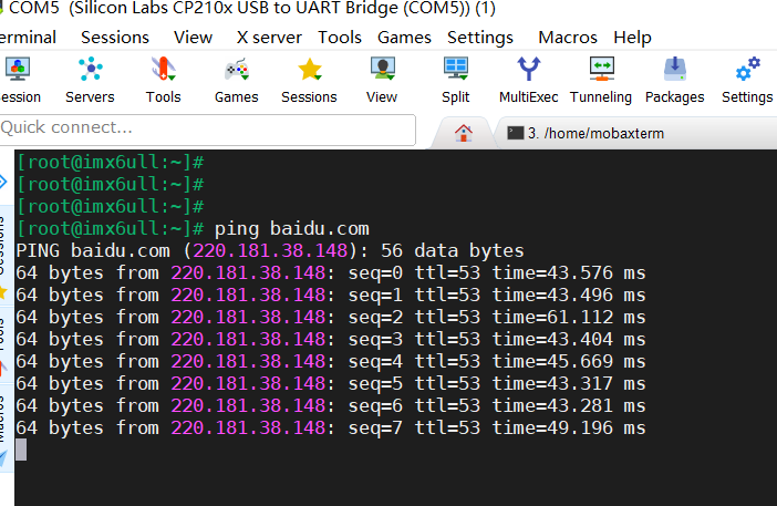 这时候如果我们的路由器可以上网的话,就可以ping得通外网,如果路由器没网的话,可以ping我们的Ubuntu主机进行测试。这里我们ping百度测试如下则表明我们的开发板已经搭建好网络环境了: