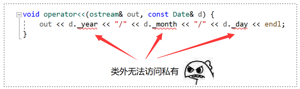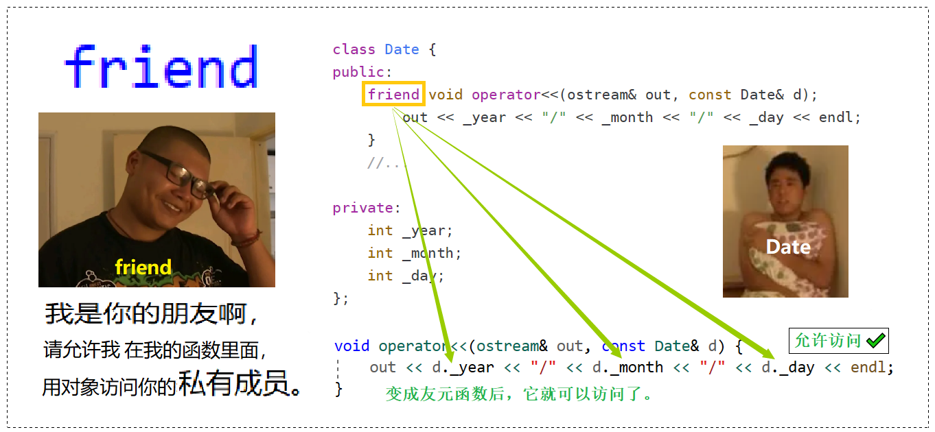 比如刚才我们想访问 Date 类,我就可以把它定义为 友元函数 ,友元的声明要放到类里面。