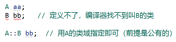 ① 内部类 B 和在全局定义是基本一样的,它只是受外部类 A 类域的限制,定义在 A 的类域中。