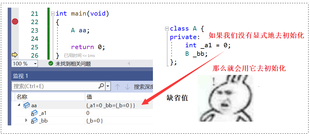 🔺 总结:如果你在初始化列表阶段没有对成员变量初始化,他就会使用缺省值初始化。