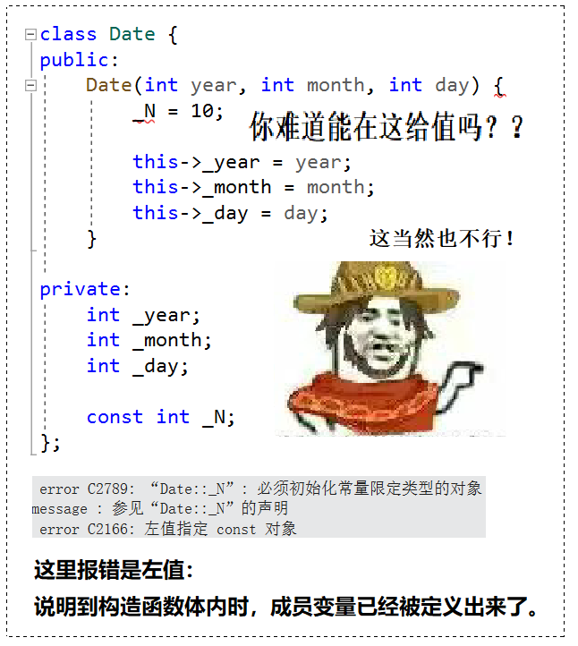 但是不能将其作为类对象成员进行初始化,构造函数体中的语句只能将其作为 "赋初值" ,