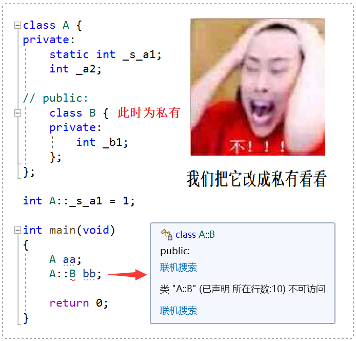 ② 内部类 B 天生就是外部类 A 的友元,也就是 B 中可以访问 A 的私有,A 不能访问 B 的私有(或保护)。