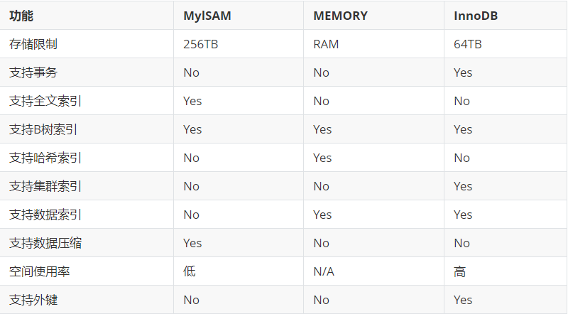 BlackHole: 黑洞引擎,写入的任何数据都会消失,一般用于记录 binlog 做复制的中继