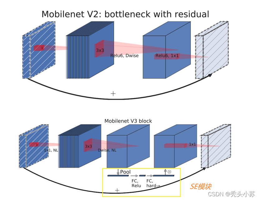 下图上半部分是V2的block,下半部分是V3的block。V2的block在上文已经提及,这里不再赘述;V3的block和V2基本一致,主要是加入了SE模块(图中黄色框部分)。怎么理解这个SE模块呢?它首先是将特征图的每个通道都进行平均池化,然后进行两个全连接层得到一个输出结果,这个结果会和原始的特征图进行相乘,得到新的特征图。【需要注意的是第一个全连接层的输出设置为原来通道数的1/4(本论文中是这么设置的),第二个全连接层输出设置为通道数】