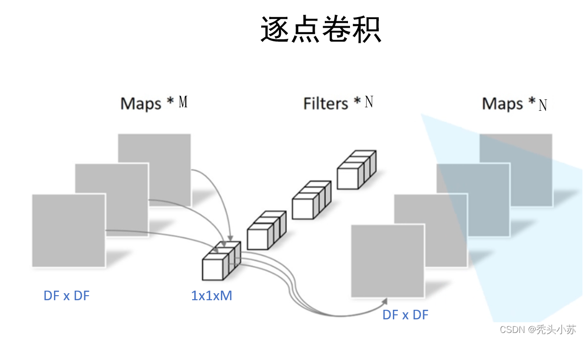 - 逐点卷积: 逐点卷积的卷积核尺寸为1×1×M,个数为N,所以参数量为M x N。