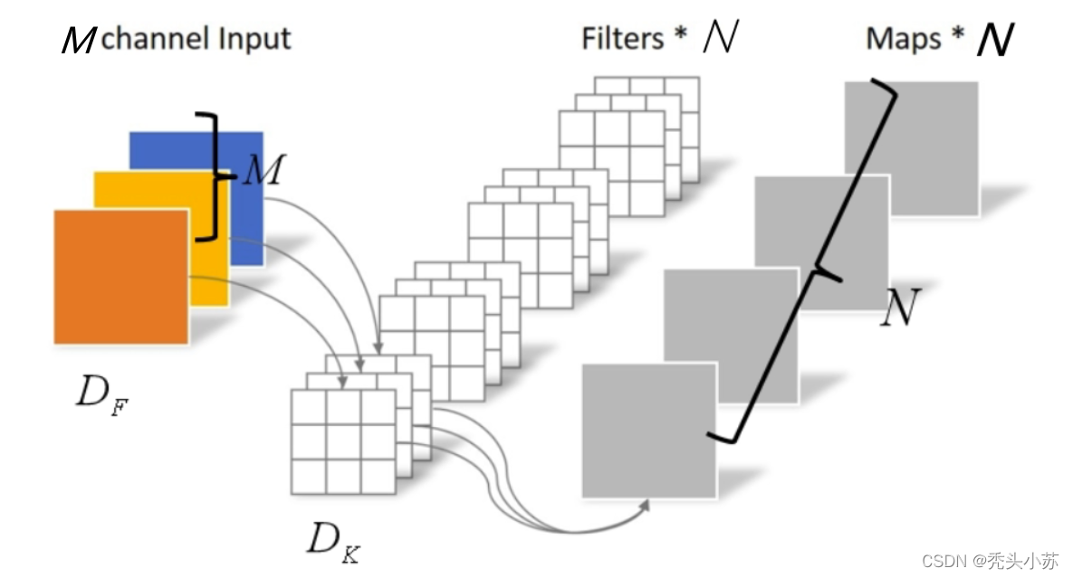 在谈及深度可分离卷积之前,我们先来温习一下标准卷积是怎么操作的。下图中我们可以看到我们的输入是1个DF x DF 大小的图片,有M个通道,卷积核大小为M x DK x DK ,有N个卷积核,那么经过卷积后输出特征图的大小为DF x DF,个数为N。【这里假设卷积后输入输出尺寸不变】