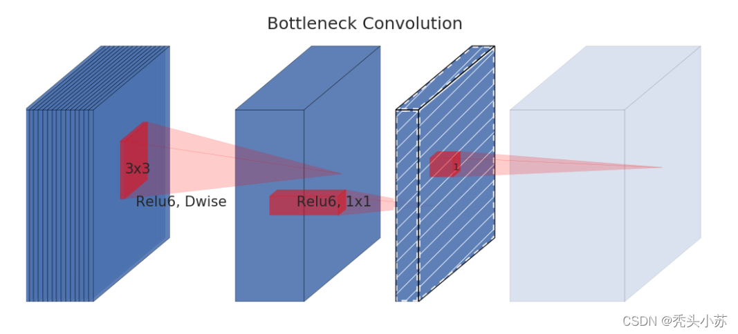 深度可分离卷积的每个块构成:首先是一个3x3的深度卷积,其次是BN、Relu层,接下来是1x1的逐点卷积,最后又是BN和Relu层。我们前文说需要把Relu激活函数替换成别的,V2将Relu替换成线性激活函数。但是需要注意的是,并不是将所有的Relu激活都换成了线性激活,而是将上图中标黄的Relu变成了线性激活函数。变换后的块文章中称为Linear Bottlenecks,结构如下图所示: