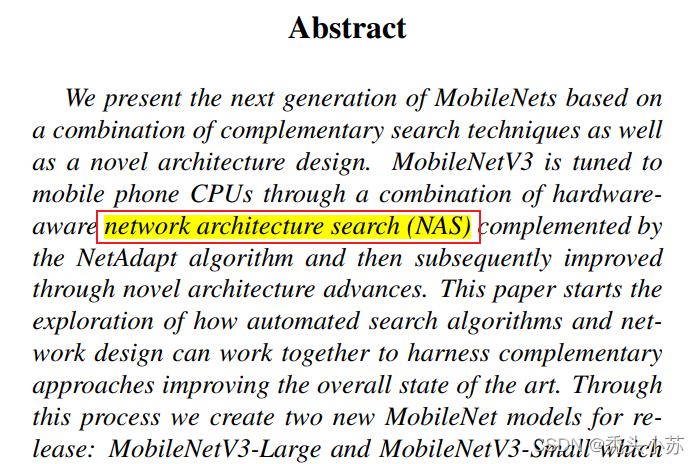 前面已经讨论了V1和V2版本的mobileNet,接下来将谈谈V3版本的MobileNet💯💯💯当刚打开论文看摘要时,就发现出现了一个生词NAS(网络结构搜索)。怎么理解呢,这里谈谈自己的看法。之前的网络,不管是VGG、ResNet、MobileNetV1、MobileNetV2,网络结构都是我们自己手动去设计的,像网络的层数、卷积核大小、步长等等参数都需要自己设置。而NAS是通过计算机来实现最优的参数设定,通过比较不同参数的网络模型效果,从而选择最优的参数设置。这么看来,NAS简直太好了,但是这也对计算机的性能要求也特别的高,感觉是土豪玩的游戏🙈🙈🙈NAS这里就不多说了,感觉离我太远,知道个大概就好,感兴趣的可以了解下!!!接下来主要谈谈论文中其它的一些改进之处。