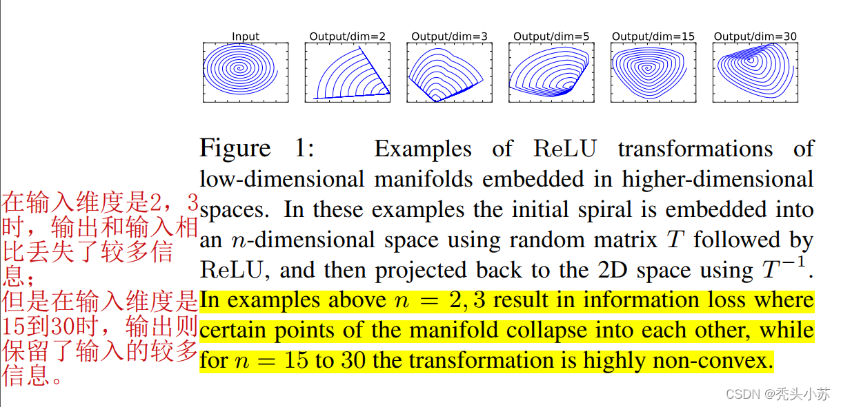 在MobileNetV1的实际训练过程中,很多人发现深度卷积时卷积核特别容易废掉,即训练完成后很多卷积核是空的,这时候MobileV2就来了。前面谈到的V1深度卷积中卷积核容易报废,V2认为造成这样的原因是由于Relu函数造成的(Relu默默流下了眼泪😢😢😢)可以看一下论文中的描述:下图标黄文字的大致意思就是说**在输入维度是2,3时,输出和输入相比丢失了较多信息;但是在输入维度是15到30时,输出则保留了输入的较多信息。**这就是说我们在使用Relu函数时,当输入的维度较低时,会丢失较多信息,因此我们这里可以想到两种思路,一是把Relu激活函数替换成别的,而是通过升维将输入的维度变高。事实上V2就是这么做的,V2的题目为Inverted Residuals and Linear Bottlenecks , Linear Bottlenecks和Inverted Residuals就是V2的核心,也是上述所说两种思路的描述。