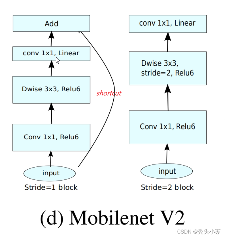 这部分需要注意的是只有当s=1,即步长为1时,才有shortcut连接,步长为2是没有的,如下图所示。