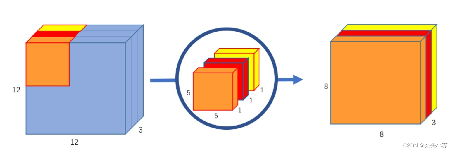 这里我们再用一个具体点的例子巩固一下深度卷积,下图中输入12×12×3的特征图,卷积核大小为5×5×1,卷积核个数为3,得到了8×8×3的输出特征图。同样的,可以发现输入特征图通道数=卷积核个数=输出特征图个数。