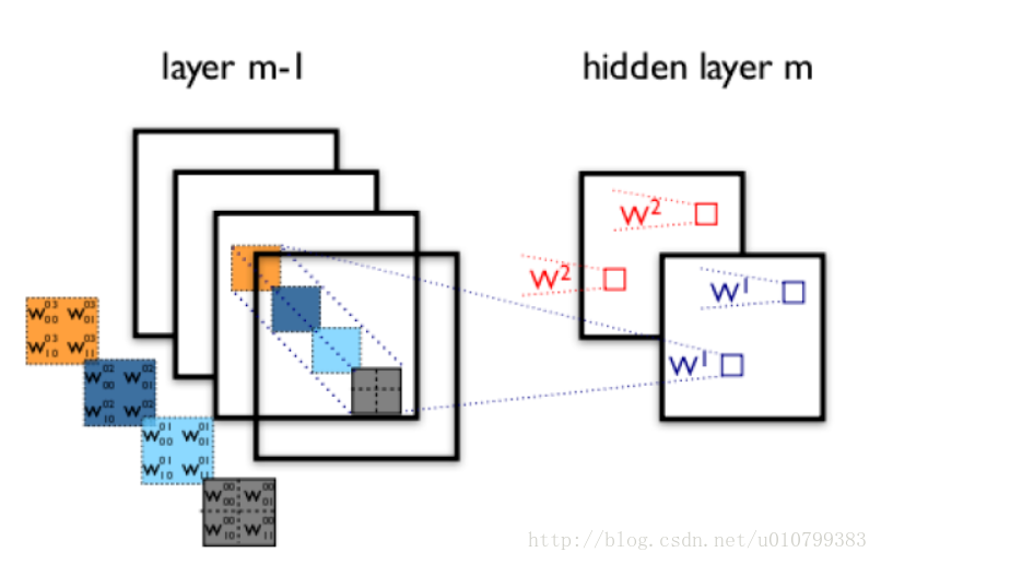 输入是多通道图片时(多feature map)的理解:下图展示了在四个通道上的卷积操作,有两个卷积核,生成两个通道。其中需要注意的是,四个通道上每个通道对应一个卷积核,先将w2忽略,只看w1,那么在w1的某位置(i,j)处的值,是由四个通道上(i,j)处的卷积结果相加,最后得到两个feature map, 即输出层的卷积核核个数为 feature map 的个数。