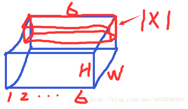 上图是一个输入是W*H*6(6为通道数理解为厚度,W*H为侧边多边形),经过一个1*1*6的卷积,将会得到W*H的一个feature map(可以理解为红色的矩形所经过的所有参数进行叠加,得到一个数字),利用5个这样1*1*6的卷积核进行卷积,将得到5个feature map,其参数个数为5*1*1*6 = 30个。