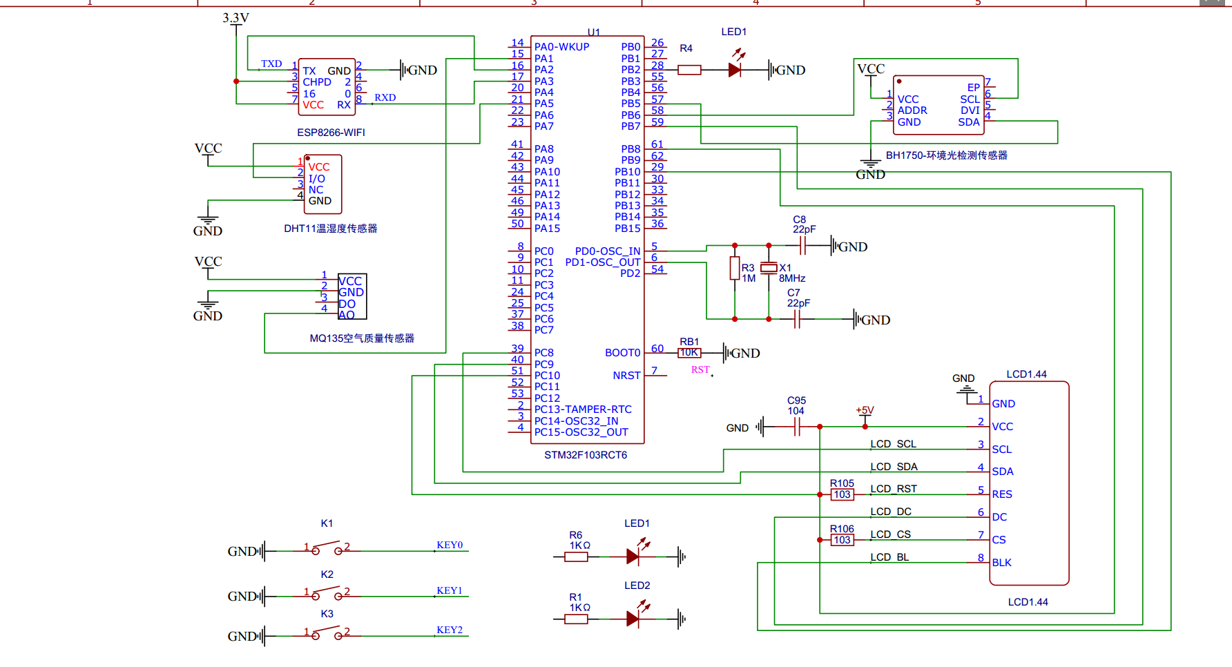 主控CPU采用STM32F103RCT6,这颗芯片包括48 KB SRAM、256 KB Flash、2个基本定时器、4个通用定时器、2个高级定时器、51个通用IO口、5个串口、2个DMA控制器、3个SPI、2个I2C、1个USB、1个CAN、3个12位ADC、1个12位DAC、1个SDIO接口,芯片属于大容量类型,配置较高,整体符合硬件选型设计。当前选择的这款开发板自带了一个1.4寸的TFT-LCD彩屏,可以显示当前传感器数据以及一些运行状态信息。