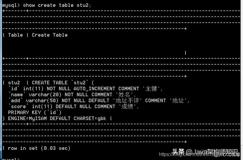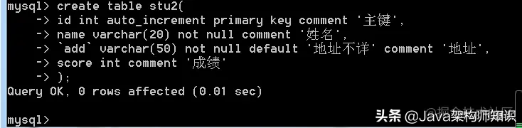 语法: create table if not exists 表名 ( 字段名 数据类型(null | not null,default | auto_increment,primary key,comment,varchar,), 字段名 数据类型 … ) engine=存储引擎 charset=字符编码
