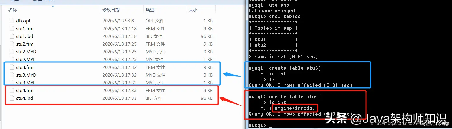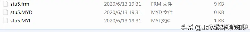 一个数据库对应一个文件夹,一个表对应两个个或多个文件,主要取决与引擎,引擎是innodb,生成一个文件。引擎是myisam生成3个文件: