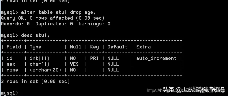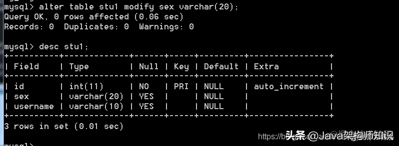 - 修改字段(不改字段名只能改属性),语法: alter table 表 modify 字段名 字段属性…