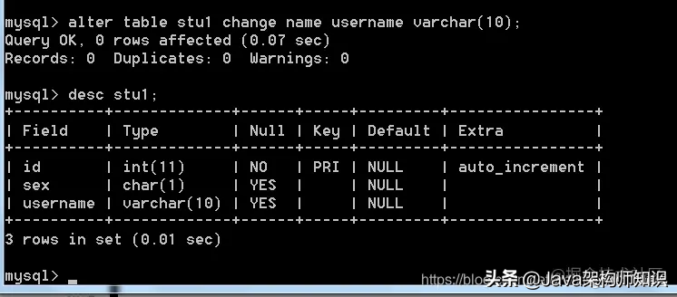 - 修改字段(改名): alter table 表 change [column] 原字段名 新字段名 数据类型…;