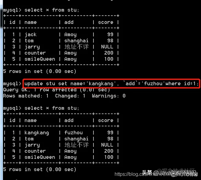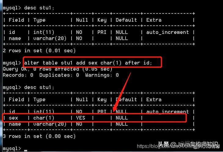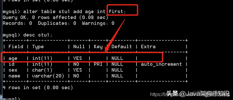 - 添加字段,语法:alter table 表名 add [column] 字段名 数据类型 [位置];