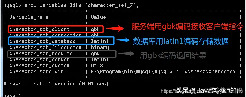 查看服务器接收返回的编码: show variables like ‘character_set_%’;
