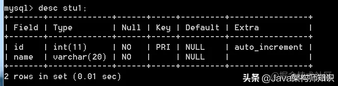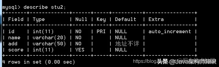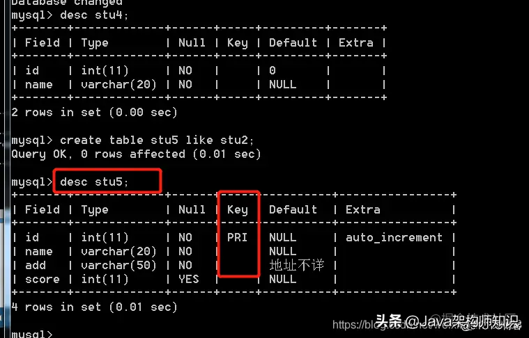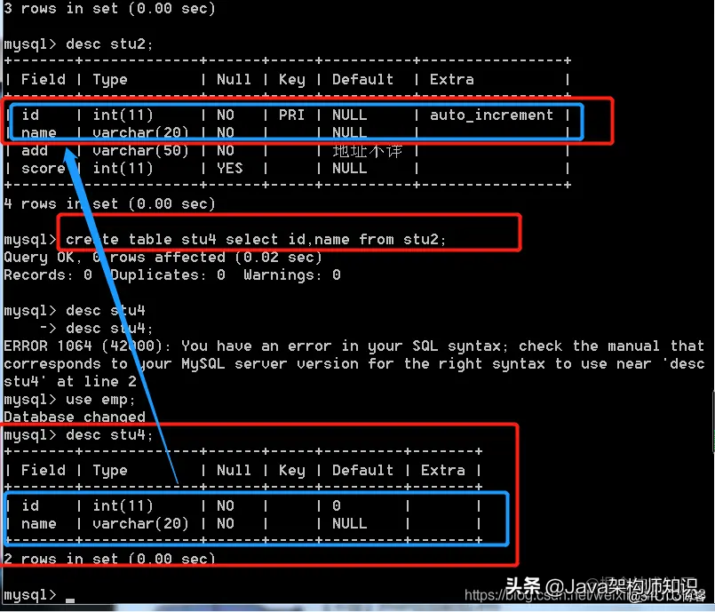 语法二: create table 新表 like 旧表; 特点: 只能复制表结构,不能复制表数据。
