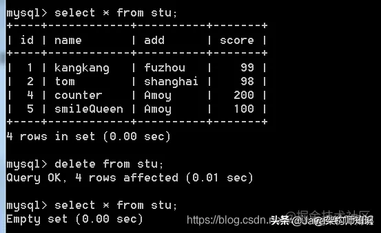 删除表中所有数据:delete from 表名 ; 或者 truncate table 表名;
