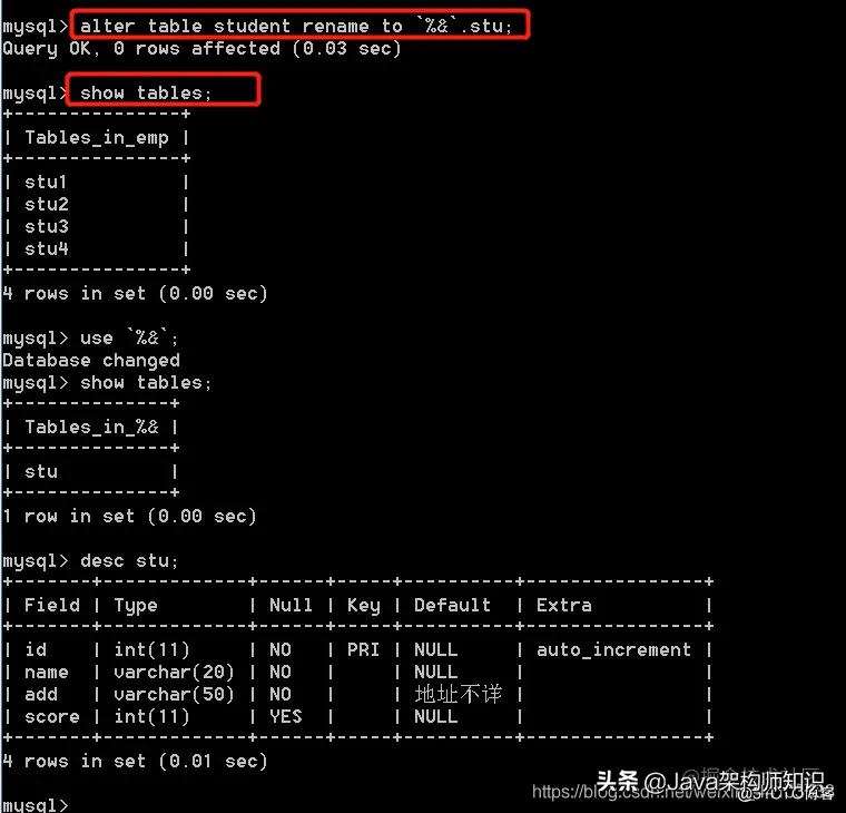 - 修改表名,语法: alter table 表名 rename to 新表名;