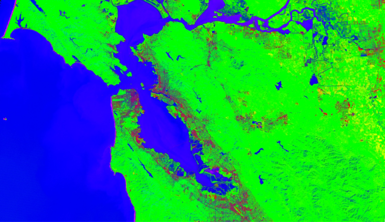 光谱分离是在地球引擎中实现的image.unmix()方法。以下是将 Landsat 5 与预先确定的城市、植被和水端元混合的示例: