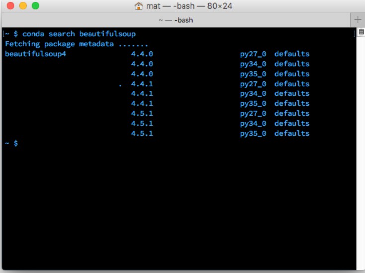 如果不知道要找的包的确切名称,可以尝试使用 conda search search_term 进行搜索。例如,我知道我想安装 Beautiful Soup,但我不清楚确切的包名称。因此,我尝试执行 conda search beautifulsoup。