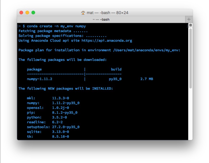 进入环境后,你会在终端提示符中看到环境名称,它类似于 (my_env) ~ $。环境中只安装了几个默认的包,以及你在创建它时安装的包。你可以使用 conda list 检查这一点。在环境中安装包的命令与前面一样:conda install package_name。不过,这次你安装的特定包仅在你进入环境后才可用。要离开环境,请键入 source deactivate(在 OSX/Linux 上)。在 Windows 上,请使用 deactivate。