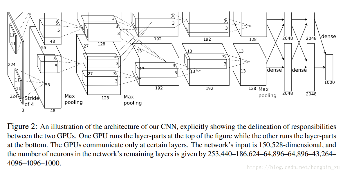 该网络包含了八层权重:前五个是卷积层,其余三个为全连接层。最后的全连接层的输出被送到1000维的softmax函数,其产生1000个类的预测。我们的网络最大化多项逻辑回归目标,这相当于在预测的分布下最大化训练样本中正确标签对数概率的平均值。第二,第四和第五个卷积层的内核仅与上一层存放在同一GPU上的内核映射相连。第三个卷积层的内核连接到第二层中的所有内核映射。全连接层中的神经元连接到前一层中的所有神经元。响应归一化层紧接着第一个和第二个卷积层,后面连接响应归一化层以及第五个卷积层。将ReLU应用于每个卷积层和全连接层的输出。