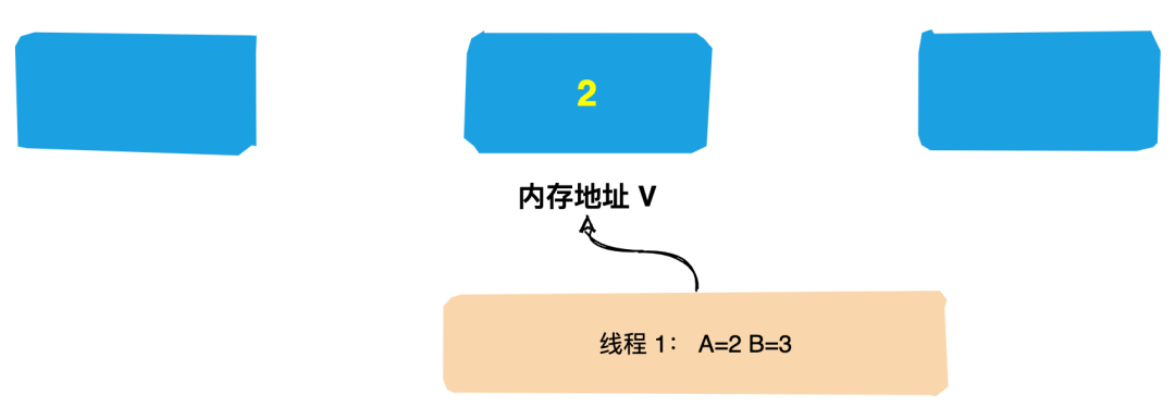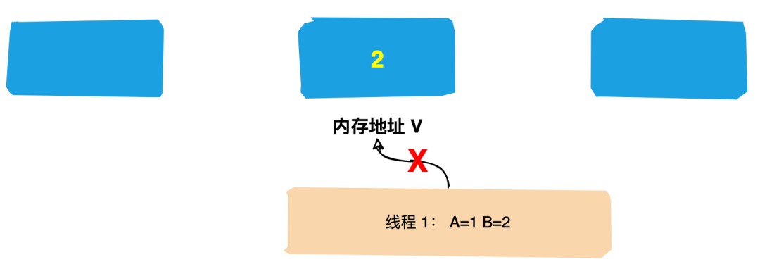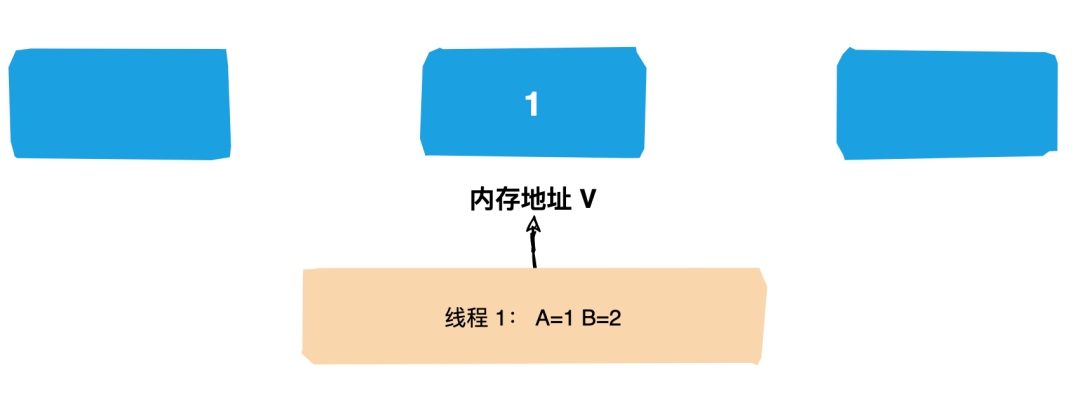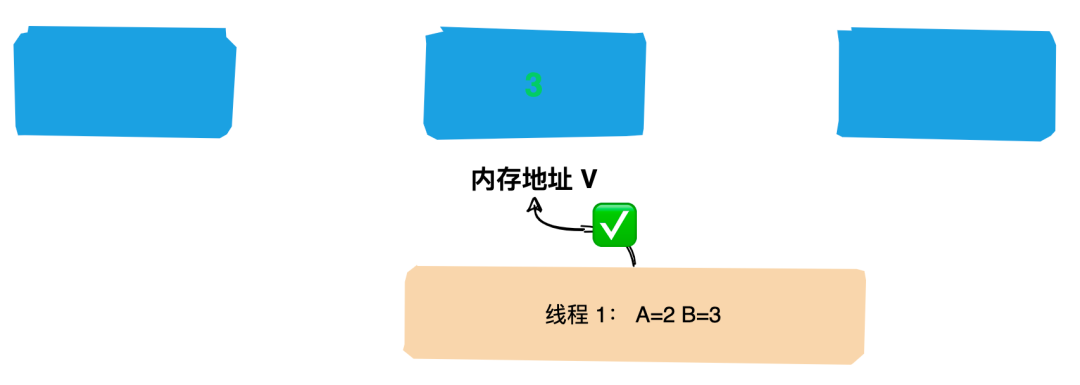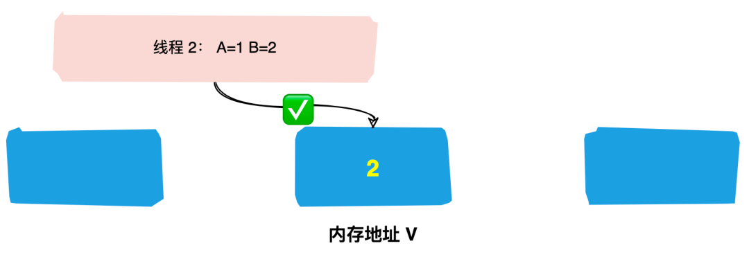 (2)线程1想要把内存地址为 V 的变量值增加1。这个时候对线程1来说,旧的预期值A=1,要修改的新值B=2。
