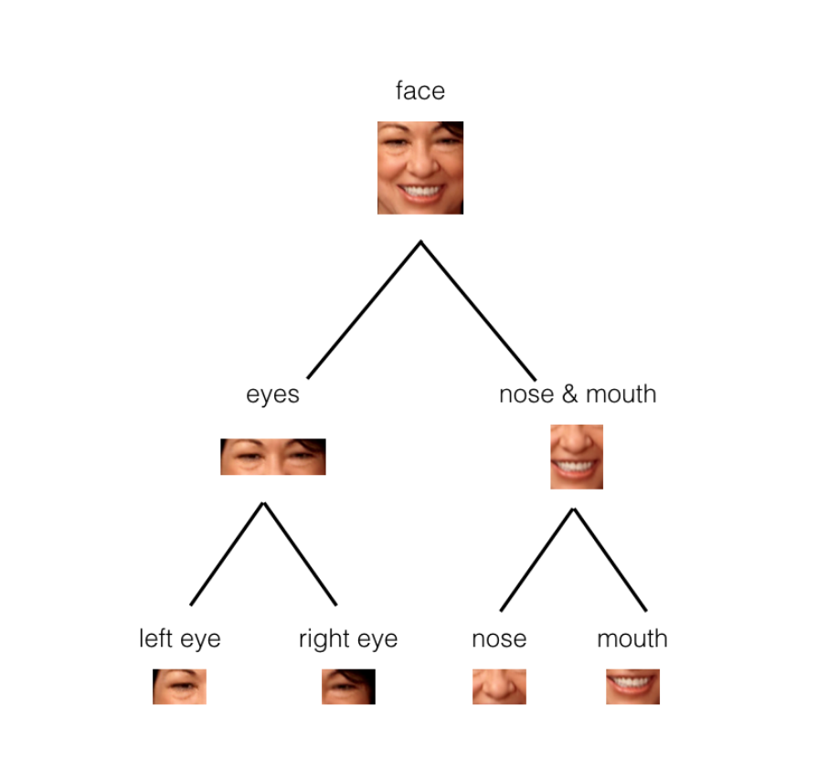 在上述示例中,模型能够识别叶节点中的人脸部分(眼睛、鼻子、嘴等),然后在父节点中形成更完整的人脸部分。