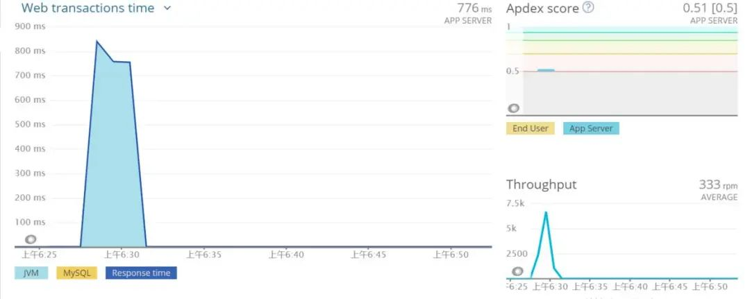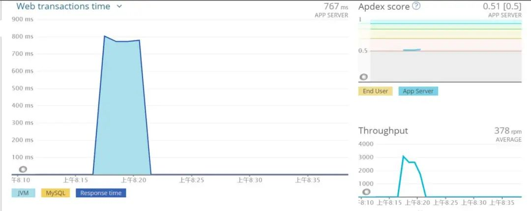 但是总觉得异步去写日志了,访问api的线程将更快响应客户端,TPS就应该有明显的变化才对。想不通又去网上查阅了一些资料,有反应说通过APM进行性能监控,同步和异步的TPS将会有较大的差别,TPS一定是会有明显变化的(呐喊),于是用APM去监控JMeter发送的请求(JMeter参数设置为线程数100,Ramp-up Period为0,循环100次):APM测试结果如下: